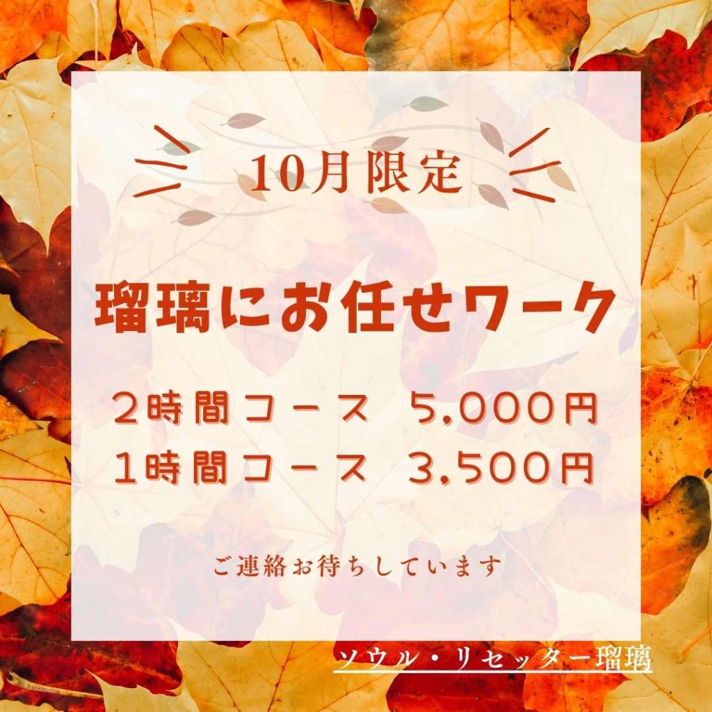 10月限定で、年内は6,800円頂戴しています 瑠璃にお任せ2時間ワーク を 5,000円でお手伝いさせていただきます。